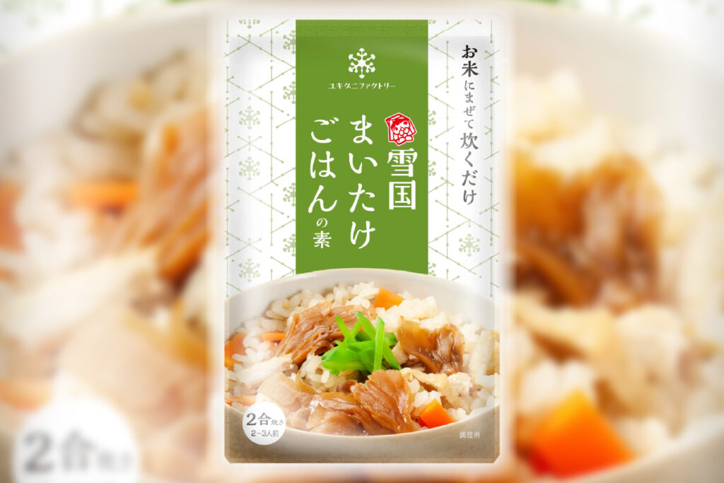 ユキグニファクトリーが作った雪国まいたけごはんの素で手軽に本格的な炊き込みご飯が作れます!きのこメーカーだからこそ贅沢にきのこを使い、こだわりのだしの相乗効果で美味しさを引き立てます。(※こちらの写真のパッケージは現在のものです)